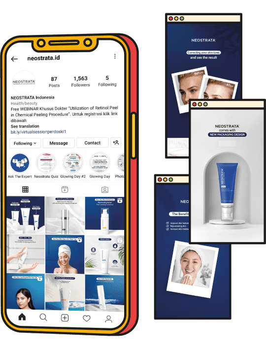 We managed Neostrata ‘s social media content with strong communication and interactive key visual that included digital imaging. At the first month, we achieved 90 new followers and 5,085 impressions organically per month.